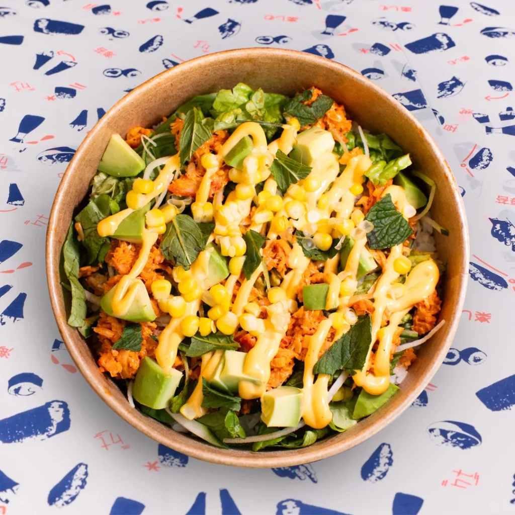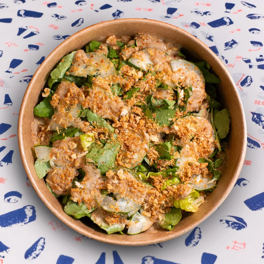 mix de lechugas orgánicas, pepino japonés, panko crocante y miso dressing