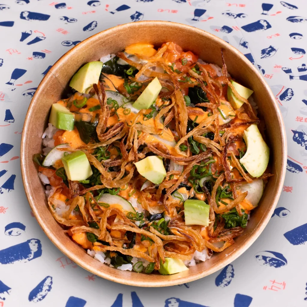 tartar de salmón, salsa de soja cítrica, palta y arroz de sushi en alga crocante.